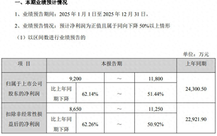 扣除非经常性损益后的净利润:本报告期预计为 8650 万元至 11250 万元,上年同期为 22921.90 万元,同比下降 50.92% 至 62.26%。