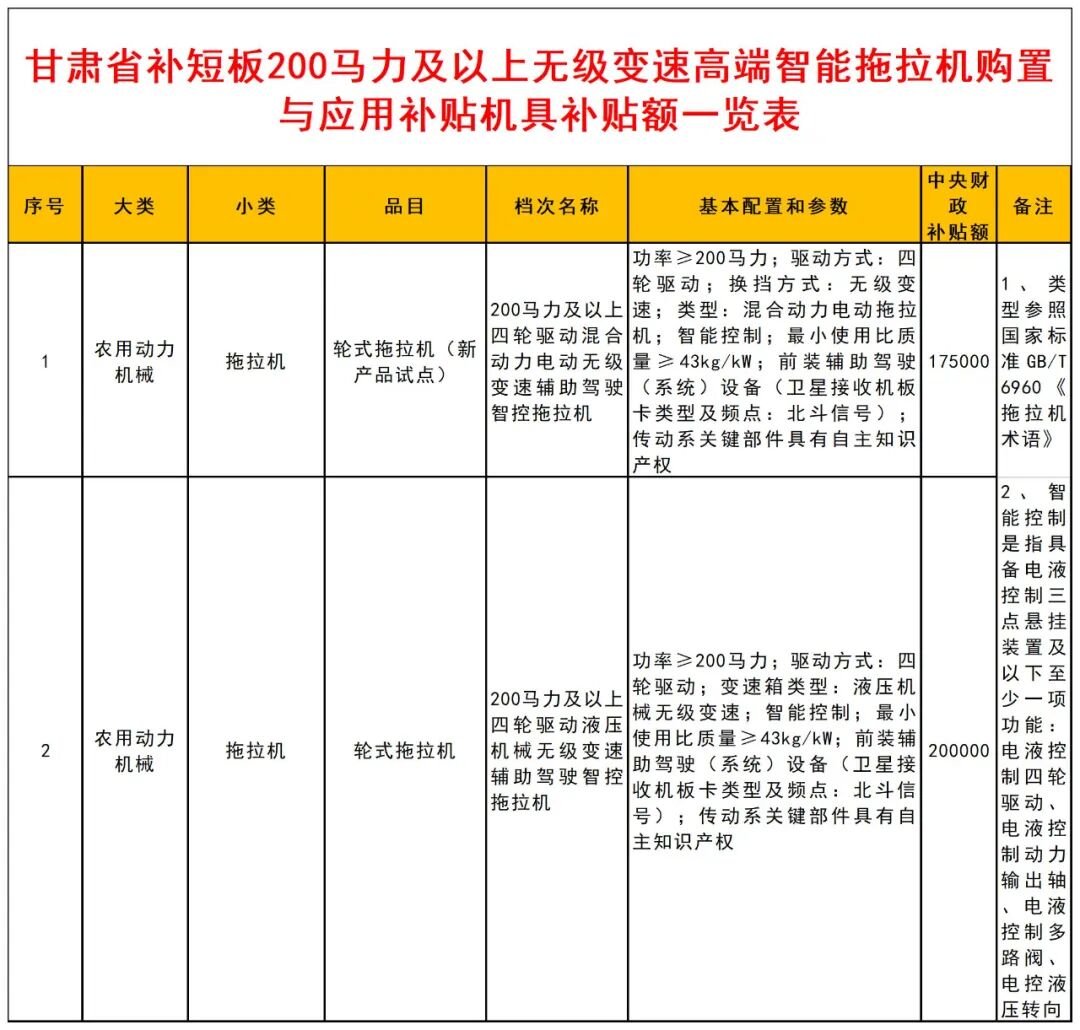 附:1.甘肃省补短板200马力及以上无级变速高端智能拖拉机购置与应用补贴机具补贴额一览表